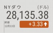 【NQNニューヨーク=横内理恵】13日の米株式市場でダウ工業株30種平均は小幅に3日続伸し、前日比3ドル33セント高の2万8135ドル38セントで終えた。米中が貿易交渉で「第1段階」の合意に達し、米政府が15日に予定していたスマートフォンなどへの対中制裁関税の発動を見送ったことが好感された。もっとも、合意期待が強まった12日に大幅に上昇していたうえ、これから始まる「第2段階」の交渉への不透明感も残り、上値は重かった。