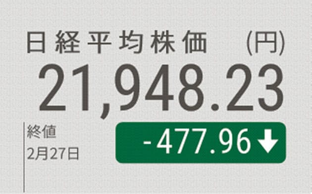 27日の東京株式市場で日経平均株価は4日続落し、前日比477円96銭(2%)安の2万1948円23銭で取引を終えた。終値が2万2000円を下回るのは2019年10月11日以来、約4カ月半ぶり。新型コロナウイルスによる肺炎の拡…
