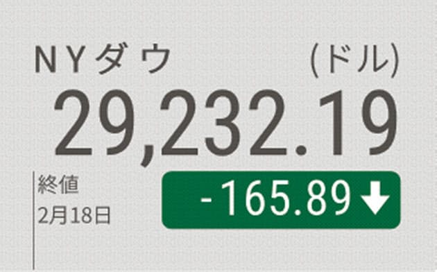 【NQNニューヨーク=川内資子】18日の米株式市場でダウ工業株30種平均は3日続落した。連休前の14日に比べ165ドル89セント(0.6%)安の2万9232ドル19セントで終えた。17日に新型肺炎の影響で1~3月期の売上高予想を達成できないと発表したスマートフォンのアップルが下落した。発表を嫌気し、半導体関連株や中国売上高が大きい銘柄にも売りが波及した。