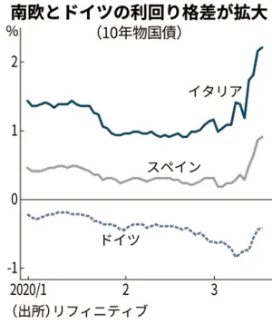 南欧の利回り上昇は、ラガルドECB総裁の「失言」が拍車をかけた。金融緩和を発表後の12日の記者会見で、国債のスプレッド(上乗せ金利)が広がっていることへの対応を問われ「ECBはスプレッドを縮めるためにいるわけではない」と述べた。当局の本気度に対する投資家の疑念を強める結果になった。