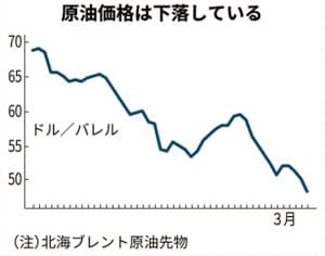 主要産油国の協議が不調に終わったと伝わると、ロンドン市場に上場する国際指標の北海ブレント原油先物は6日に一時、前日比9%安の1バレル45ドル台まで下落した。