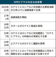 OPECプラスが続けてきた枠組みは、今年1~3月で18年秋に比べ日量170万バレルの減産。中国から広がった新型コロナの感染拡大が企業活動や人の移動に必要な燃料需要に影を落とし、サウジなどOPEC加盟国は原油価格の下落に歯止めをかけるため、減産の拡大を進める考えだった。
