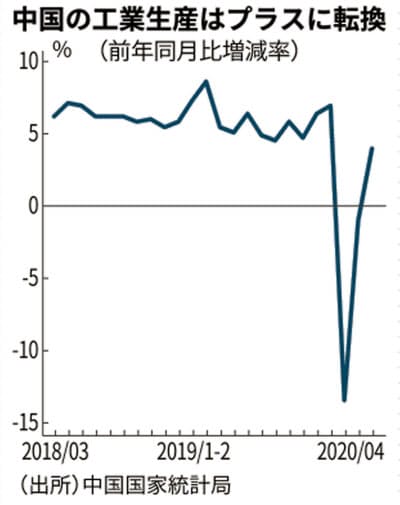 一方、同時に発表したスーパーや百貨店、電子商取引(EC)などの売上高を合計した社会消費品小売総額は4月に前年同月比7.5%減った。減少幅は3月(15.8%減)から縮小したが、依然としてマイナスだ。「巣ごもり消費」で食品や飲料などの販売が好調だった。レストランの売上高は同31%も減っており、回復が鈍いままだ。