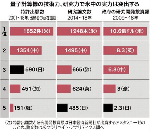 現在、量子計算機関連の研究を主導するのは米中だ。米国は特許出願や論文の数でリードし、中国が猛追する。特にハードウエアの開発ではグーグルやIBM、中国のアリババ集団などが圧倒的な存在感を放つ。