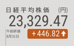 31日午前の東京株式市場で日経平均株価は大幅に反発し、前週末比446円82銭(1.95%)高の2万3329円47銭で前場を終えた。安倍晋三首相の後任を選ぶ自民党総裁選で菅義偉官房長官が出馬を検討していると伝わり、政策の連続性が保たれるとの期待感が浮上した。米投資会社が大手商社株を買ったことも追い風となった。