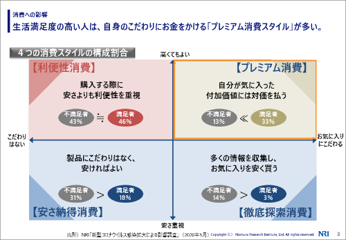 ただその詳細を見ると、少し様相が変わってくる。NRIでは消費者を「高くてもよいか安さ重視か」「お気に入りにこだわるかこだわりはないか」という2つの軸によって4つのスタイルに分類している。そのなかの1つに、満足者が不満足者を上回った層があったのだ。