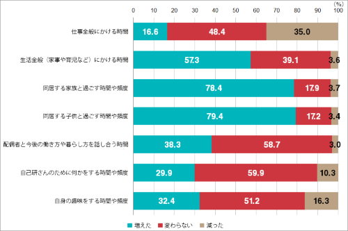 同じNRIのデータから違った角度でも見てみよう。新型コロナウイルスの影響で、何の時間が増えて、何の時間が減ったかというデータだ。大きく増えたのが、「家族と過ごす時間や頻度」と「子供と過ごす時間や頻度」の2つ。「時間の使い方が変わったことで、どうやって家族を設計していくのか。少なからずみんなが自分ごとになったことが大きい」(野村総合研究所 未来創発センターの武田佳奈氏)