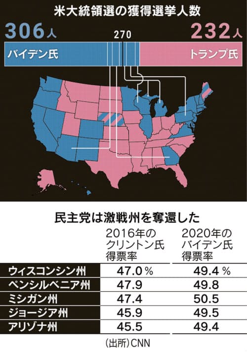 【ワシントン=中村亮】トランプ米大統領は大統領選での敗北を認めていないが、逆転勝利の道は狭まっている。13日に全米の勝敗が判明し、民主党のバイデン前副大統領が得た選挙人は306人、トランプ氏は232人と大差がついた。選挙結果が正式に確定すれば、トランプ氏が2024年の大統領選に再出馬を表明するとの観測も浮上している。