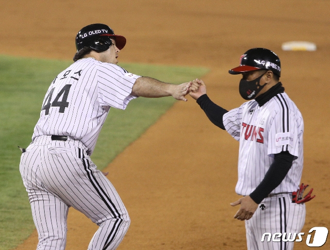 (서울=뉴스1) 신웅수 기자 = 21일 오후 서울 잠실야구장에서 열린 '2021 신한은행 SOL KBO리그' LG트윈스와 KIA타이거즈의 경기 7회말 LG 공격 2사 1, 2루 상황에서 LG 라모스가 홈런을 친 후 베이스를 돌고 있다. 2021.4.21/뉴스1