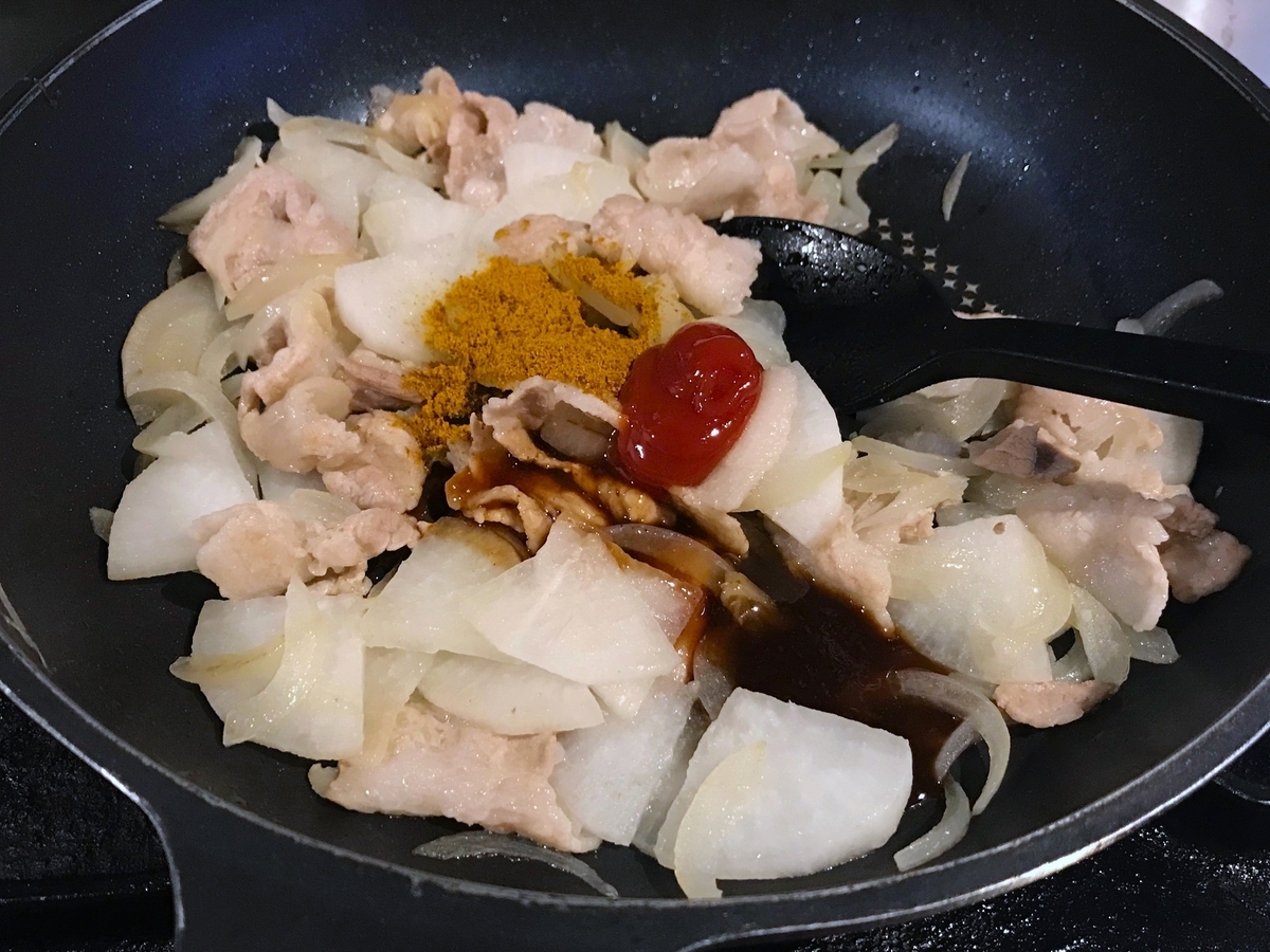 炒めて甘みが増すだけでなく、豚バラから出た脂もまとった大根は間違いのない美味しさ。そこに、いろいろなうま味が凝縮されたトマトケチャップと中濃ソース、さらにスパイシーなカレー粉の風味もプラスして、白メシを呼びすぎるドライカレーを作りますよ。