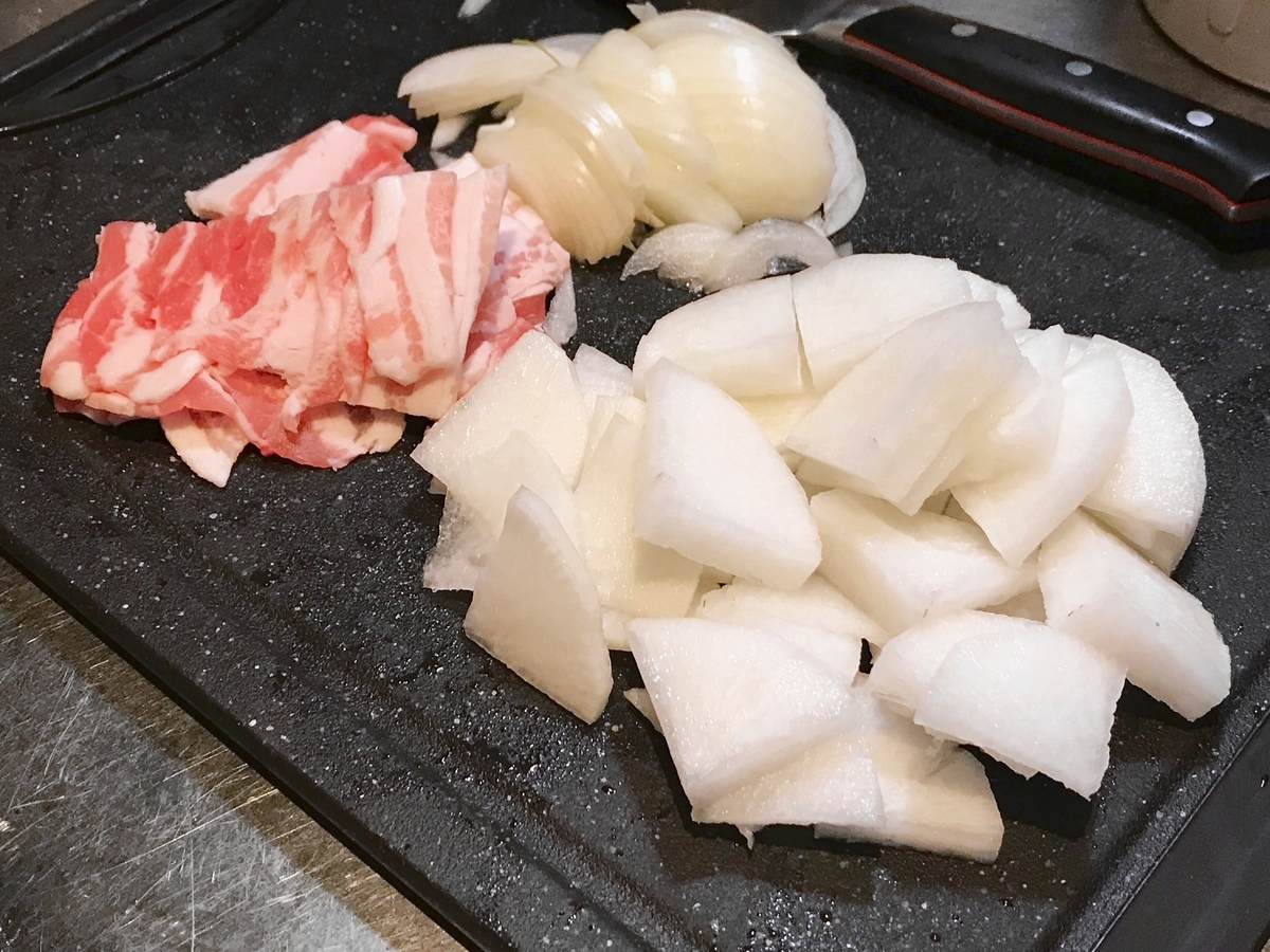 1. 大根は5mmくらいの厚さのいちょう切りにする。玉ねぎは縦に薄切りにする。豚バラ肉は5cm幅に切る。